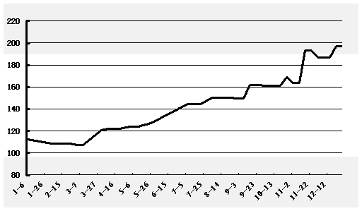 CRU不锈钢价格从06年年初的112.1点上升到年末197点,高出原来的84.9个点,同比增长75.73%。依据当前国际不锈钢局势,我们不难发现,受强劲增长的经济支撑,世界不锈钢的价格空前高涨,尽管在年末有小幅跌落现象,但是短时间内的涨势仍较为明显,这证实了CRU的价格指数仍将朝着高位盘整的态势向新一年迈进。
