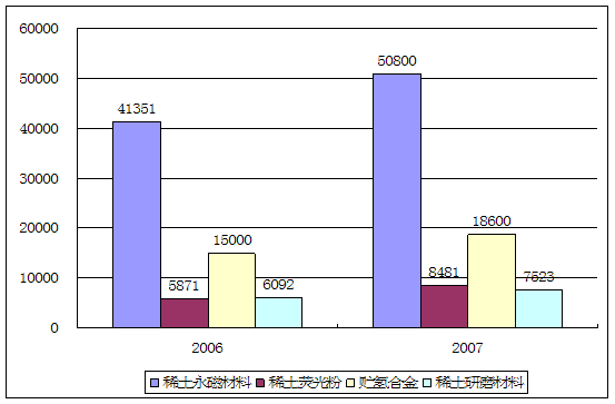 2007年,贮氢合金产量达到18600吨(实物),比上年增长24.00%。稀土研磨材料产量为7523吨(实物),比上年增长23.49%,其中:液晶抛光粉2819吨(实物),比上年增长38.45%。
