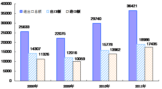 2011年全年进出口总额36421亿美元,比上年增长22.5%;出口18986亿美元,增长20.3%;进口17435亿美元,增长24.9%。进出口相抵,顺差1551亿美元,比上年减少264亿美元。贸易方式继续改善。进出口总额中,一般贸易进出口19246亿美元,增长29.2%,占进出口总额的52.8%,比上年提高2.7个百分点;加工贸易进出口13052亿美元,增长12.7%。出口额中,一般贸易出口9171亿美元,增长27.3%;加工贸易出口8354亿美元,增长12.9%。进口额中,一般贸易进口10075亿美元,增长31%;加工贸易进口4698亿美元,增长12.5%。