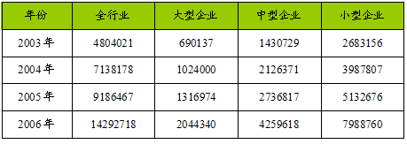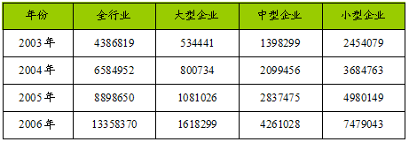 2003年-2006年船用配套设备制造业不同规模企业总销售收入 分析