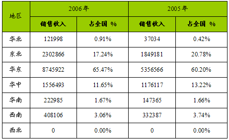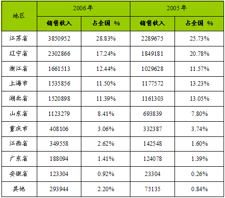 2006年船用配套设备制造业产品销售份额集中度按地区 分析