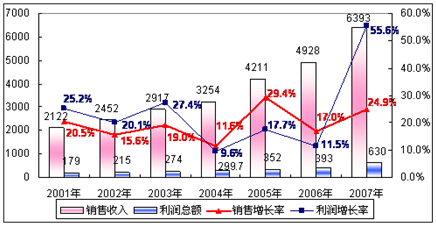 2001-2007年全国医药工业销售收入及利润总额增长状况