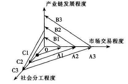 如图所示,产业链的形成首先是由社会分工引起的,在交易机制的作用下不断引起产业链组织的深化。在图中,C1、C2、C3表示社会分工的程度,其中,C3>C2>C1表示社会分工程度的不断加深;A1、A2、A3表示市场交易的程度,A3>A2>A1表示市场交易程度的不断加深;B1、B2、B3表示产业链的发展程度,其中,B3>B2>B1表示产业链条的不断延伸和产业链形式的日益复杂化。三个坐标相交的原点0,表示既无社会分工也无市场交易更无产业链产生的初始状态。