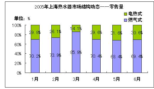 上海燃气热水器市场上半年的增长主要体现在3月份的数据上。赛诺数据显示,上海热水器总体市场的结构一直比较稳定,燃气热水器零售量占了上海热水器市场的70%左右;而在2005年3月,上海燃气热水器的零售量比例远远超过了70%,达到了85.9%。