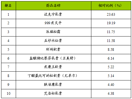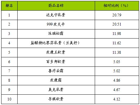 2007年全国药品零售市场皮肤科用药(化学药)销售排行