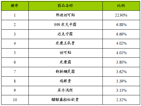 据《中国药品零售 市场 研究 报告》的数据显示,在皮肤用药中最突出、最稳定的莫过于上海强生公司的邦迪创可贴。在用药数量市场份额的每月数据中,居首位的几乎总是邦迪创可贴,三年来月月如此,市场份额在20%-30%之间,而且每月之间相差不超过5个百分点。