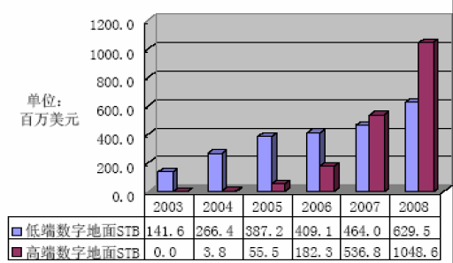 高端产品增长迅速,2006年超过低端产品产值。机顶盒服务功能正从单纯服务于DTV接入向家庭网关/媒体娱乐中心发展。