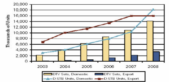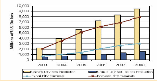 2008年中国DTV终端产值达110亿(2003年为28亿,其中超过70%满足国内市场需要)。