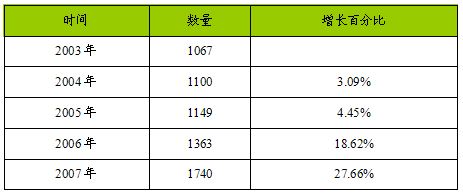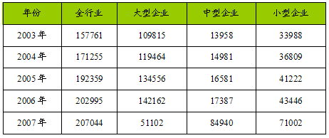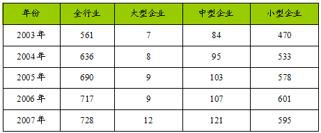 2007年我国有规模以上企业只有728家,规模以上就是年销售收入500万元以上,规模以下企业大约有1600余家。