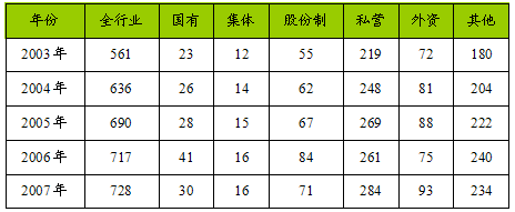 2003-2007年液体乳及乳制品制造市场不同有制主要企业数量 分析
