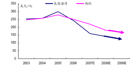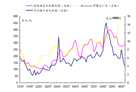 目前国际上80%以上的甲醇生产都是以天然气为原料,因此天然气的供应状况及价格的高低对甲醇市场影响很大。今年以来,全球市场甲醇价格整体维持高位,并有逐步下降的趋势。预计,国际市场甲醇价格将会缓慢下调到200美元/吨左右。到2007年底或2008年初,当国际大型甲醇装置投产后,甲醇市场的竞争将会大大加剧。