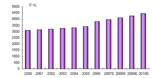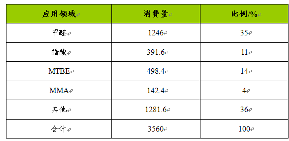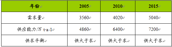 中国已成为世界第二大甲醇消费国。2005年,国内甲醇表观消费量突破600万吨,达到666万吨,比2004年增长16%;2006年我国甲醇表观消费量仍保持高速增长,预计消费量将超过800万吨;到2010年中国将成为全球甲醇的最大消费国,对甲醇的需求量将达到934万吨。