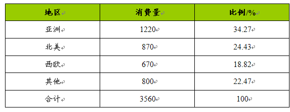 世界甲醇需求量超过3320万吨,供应量约为3410万吨,预计全球甲醇需求量为3800万吨左右。全球甲醇需求年增长率约在4%以上,今后5年亚太地区甲醇需求将从1300万吨/年增加到1800万吨/年。到2010年,全球甲醇产能将达到5099万吨,需求量约为4226万吨。而与此同时,世界甲醇生产格局的变化导致消费格局发生重大变化。如工业发达的美国、西欧、日本等已经由甲醇自产自给国转变为主要进口国,而加拿大、东欧、中东等国目前已成为甲醇的主要生产国。