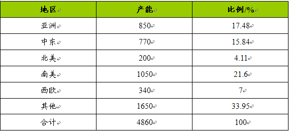 截至2006年底世界甲醇的总生产能力接近4800万t,06年总需求达3680万t。世界甲醇生产主要集中在天然气资源比较丰富的地区,如特立尼达、智利、新西兰、沙特和俄罗斯,中国已成为世界甲醇主要生产地区,中国甲醇主要以煤炭为原料。其中亚太地区的生产能力为1410万t/年,约占世界总生产能力的30%,中东及非洲地区的生产能力为1217万t/年,约占总生产能力的25%,北美地区的生产能力仅为60万t/年,约占总生产能力的1.2%,南美地区的生产能力为1256万t/年,约占总生产能力的26%,世界其他地区的生产能力为854万吨/年,约占世界总生产能力的17.8%。世界主要甲醇生产企业都是将甲醇作为商品销售,自用量很少。同时大型甲醇生产企业都拥有自己的远洋运输船队和储运设施,以便将生产的甲醇运往世界各地销售。