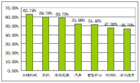除文化办公 行业 进口增速高于出口增速,2007年机械工业其他各分 行业 的出口增速均高于进口增速。出口增速最高的是工程机械 行业 (62。74%),其后依次是农机 行业 (59。76%)、食品包装 行业 (58。75%)、汽车 行业 (51。99%)、重型矿山 行业 (51。48%)、内燃机 行业 (47。8%)和石化通用(46。7%)等 行业 。