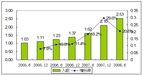 2005.6-2008.6我国网民人数增长情况