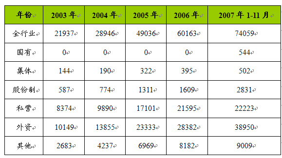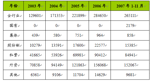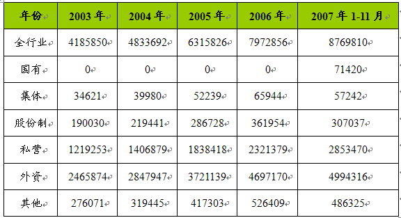 2003-2007年1至11月制帽市场不同所有制主要企业销售费用比较 单位:千元