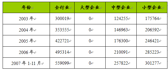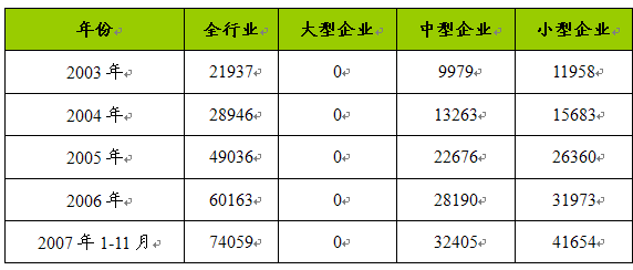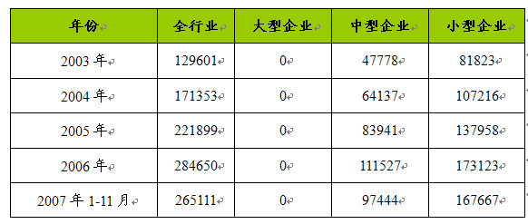 2003-2007年1至11月制帽市场不同规模主要企业销售成本比较 单位:千元