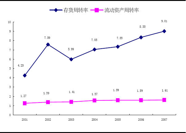 平均净利润率从2003年1.76%提高到2006年3.37%;平均净资产收益率从3.93%提高到8.85%;平均毛利率从16.8%提高到18.19%;平均综合毛利率从18.49%提高到20.24%。平均存货周转率从2003年的12.82次提高到2006年的15.67;平均期间费用率从17.38%下降到14.69%。