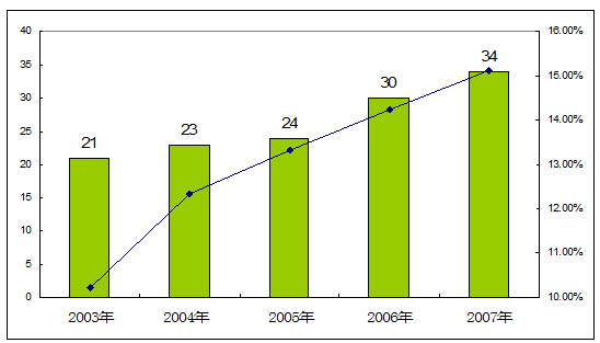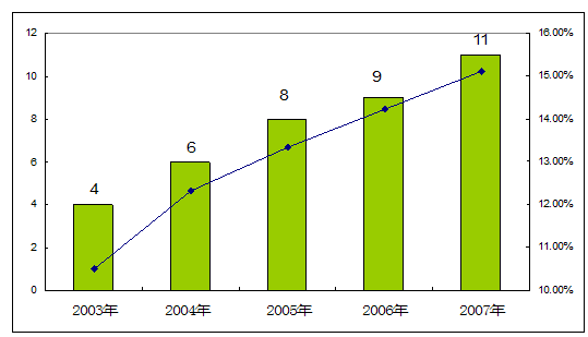 2003-2007年中南市场生产企业数量变化 分析 单位:个