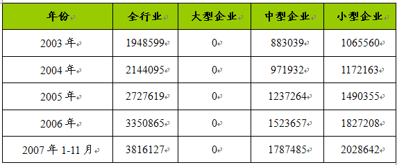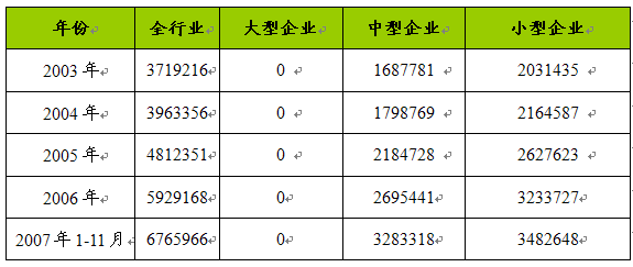 2003-2007年1至11月制帽市场不同规模主要企业固定资产比较 单位:千元