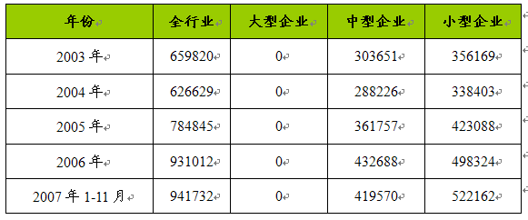 2003-2007年1至11月制帽市场不同规模主要企业流动资产总额 单位:千元