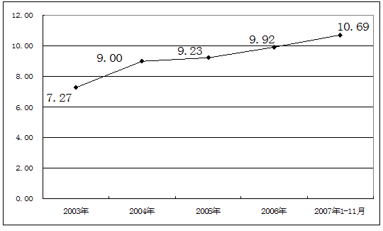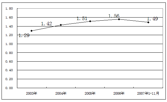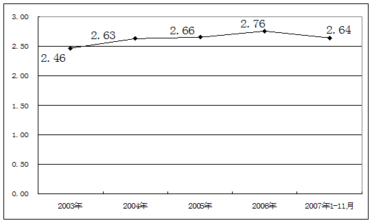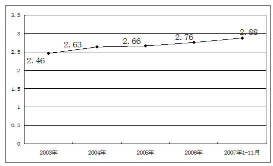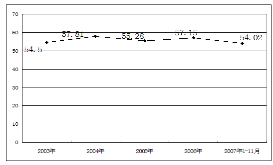 2003-2007年1至11月制帽市场资产负债率 单位:%