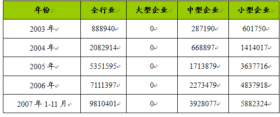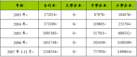 2003-2007年1至11月助动自行车制造市场不同规模主要企业固定资产比较 单位:千元