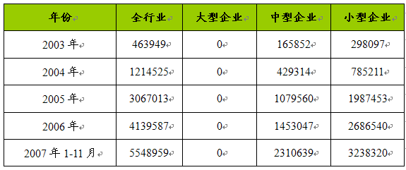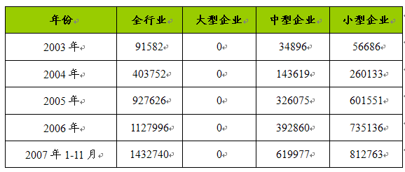 2003-2007年1至11月助动自行车制造市场不同规模主要企业流动资产总额 单位:千元