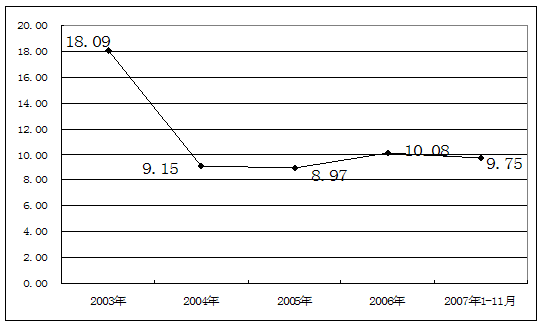 2003-2007年1至11月助动自行车制造市场资本保值增值率 单位:%