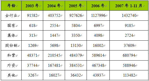 2003-2007年1至11月助动自行车制造市场不同所有制主要企业总资产比较 单位:千元