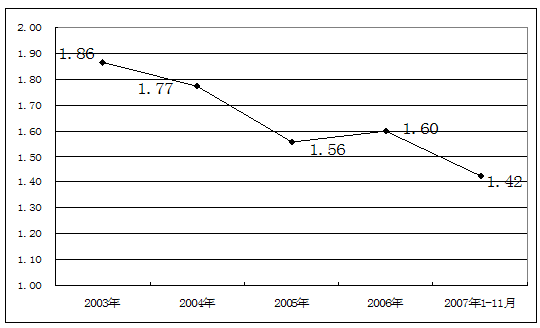 2003-2007年1至11月助动自行车制造市场流动资产周转次数 单位:次