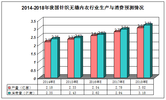 图表302014-2018年我国针织无缝内衣 行业 生产与消费预测情况