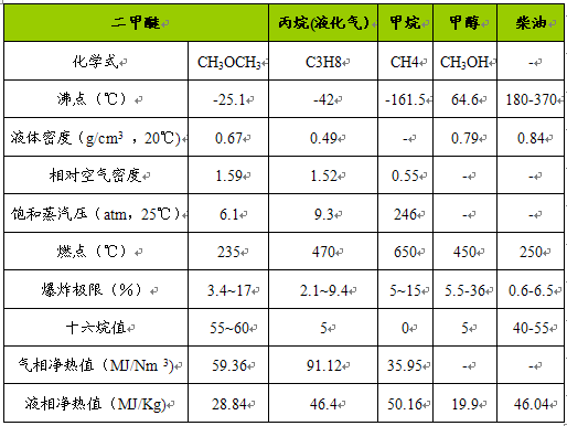 二甲醚是一种无色、无毒、无致癌性、腐蚀性小的产品,常温下蒸气压力为0.5MPa,同等温度下,二甲醚的饱和蒸气压低于液化气,储存运输比液化石油气更安全,并且燃烧性能好,热效率高,燃烧过程中无残渣、无黑烟,CO、NO排量低,二甲醚还可掺入石油液化气、煤气或天然气混烧并能提高热量,≥95%二甲醚可直接作为替代液化气的燃料使用。所以,它将可能是取代液化气的一种理想的清洁燃料。
