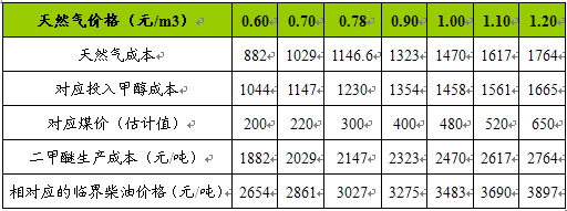 我们按目前工业用天然气价格1.10元/M3计算,每吨二甲醚的成本在2500元左右。天然气价格将是影响二甲醚生产成本的关键因素。
