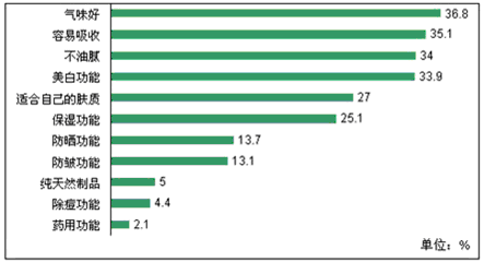 据IMI消费年鉴数据显示:46.9%的被访者表示比较固定地使用两个或者三个牌子,37.9%的被访者表示基本固定使用一个牌子,而只有15.2%的被访者表示基本上不固定使用某一品牌,由此可见广州消费者对护肤品的品牌忠诚度较高。广州消费者购买护肤品主要考虑的因素是品牌知名度、产品功能、价格适中等因素,由此可见广州消费者消费较为理性。在考虑产品功能方面广州消费者主要考虑的因素依次为气味好、容易吸收、不油腻、美白功能、适合自己肤质、保湿功能、防晒功能、防皱功能等因素。