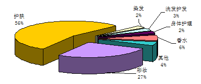 护肤类产品是化妆品中零售份额最多的,占到了54%以上,彩妆类其次,占到27%。其中,彩妆类的脸部产品占到该大类的46%,是最多的一部分;唇部产品其次,占到该大类的30%。护肤类的脸部润肤品占到该大类的70%,洗面乳占到该大类的20%。