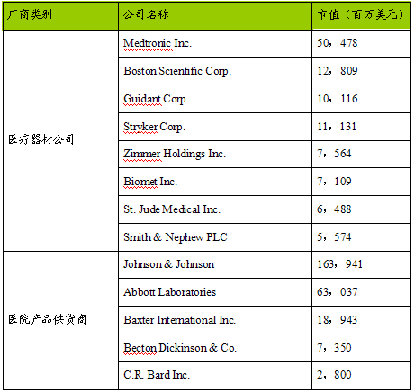 一般来说美国医疗器材厂商依照公司型态可分为两大类,一类为生产如心跳节律器(pacemaker)、支架等产品之医疗器材公司(包括Medtronic、BostonScientific、Guidant、Stryker、ZimmerHoldings等),另一类则是生产如针筒、伤口敷料等医院用品之供货商,而一般情况下前者更具高风险与高获利的产业特性。举例来说,如专门使用于介入性心脏科(interventionalcardiology)及整形外科手术的植入式医疗器材产品,其利润就远高于如压舌板或医疗纱布等常见医疗器材,因此医疗器材公司虽然在产品研发过程中背负较大之风险,但与医院用品供货商相比之下,却可创造更多市场价值。不过必须特别注意的是,对于美国最大的几家医疗器材厂商如Johnson&Johnson、Abbott、Baxter、BD或C.R.Bard等来说,由于这些集团的产品项目涵盖了各个技术层次,因此并不适用于上述之定义。