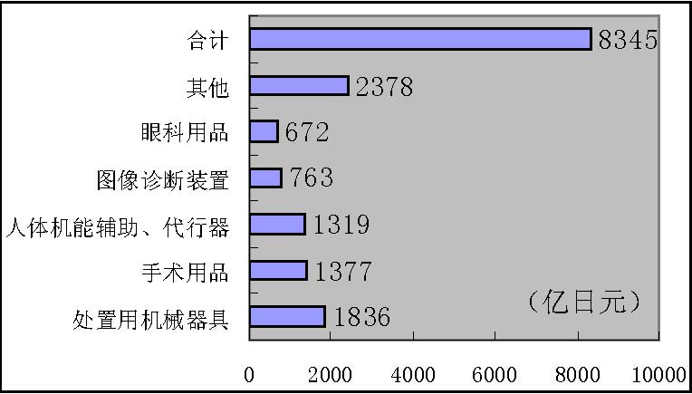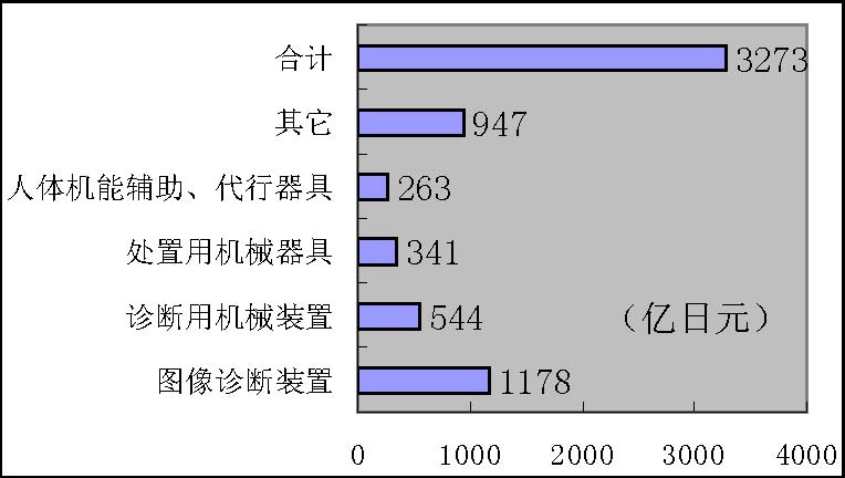 医疗器械和器材用具的种类很多,细目有2万多个,日本厚生省将其划分为15个大类。其中图像诊断装置产值最多,1998年为3034亿日元,占总值的20%。其次是处置用机械器具,产值为1742亿日元,占总值的11.4%。人体机能辅助、代行器具、家庭用治疗器具、医用放射线装置和眼科用品的产值,也都在1000亿日元以上,这6大类医疗器械和器材的合计产值近1万亿日元,占总值的近2/3。
