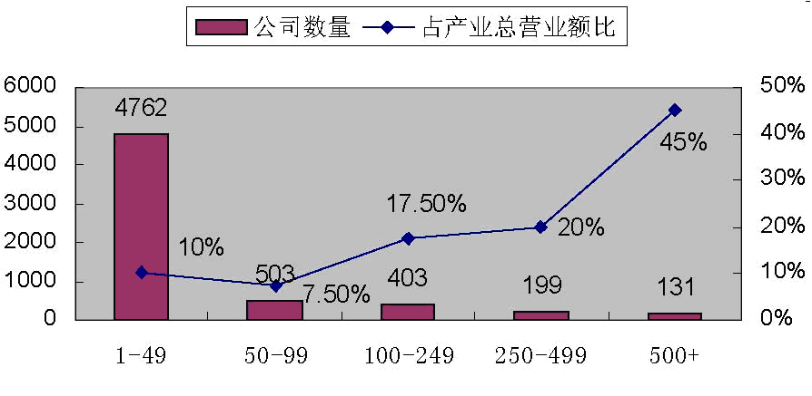 在企业规模方面,美国国内医疗器材厂商数将近6000家,各家公司(或企业)规模差距悬殊,小至医疗器材发明者本人成立的一人公司,大至如Johnson&Johnson雇用超过10万名员工的超大企业,然而绝大多数的公司(或企业)规模普遍不大,80%以上的公司员工人数低于50人。若依公司营业额占产业总营业额之比重来看,公司规模超过500名员工的厂商其营业额约占整体产业营业额之45%。