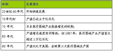 70年代10年中,6年的年增长率超过20%,3年超过10%,只有1年在10%以下,年均增幅为20%,产值由1970年的1188亿日元猛增到1980年的7202亿日元。进入80年代以后,产值增长速度有所降低,1981年~1998年的18年间,只有1年的增长率高于10%,其他年度都为1位数,1994年还出现了负增长。1987年,日本医疗器械产业的产值第1次超过1万亿日元,1998年为15214亿日元。
