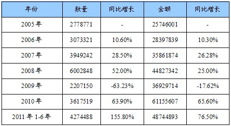 2005-2011年其他以石墨等碳为主的糊状、板块状制品进口量值统计