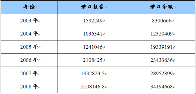 2003-2008年我国陶粒页岩进口数量及金额统计 单位:千克;美元