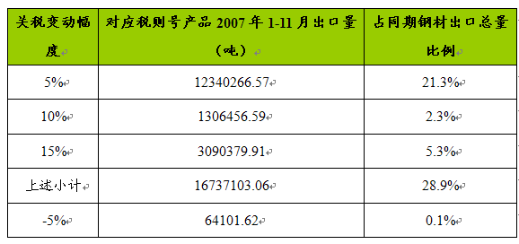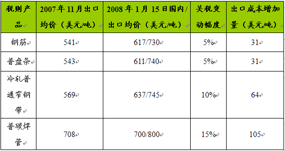 2007年12月26日,《国务院关税税则委员会关于2008年关税实施方案通知》(税委会〔2007〕25号)规定,从2008年1月1日起,对螺纹钢、部分棒材和线材产品的出口关税上调5个百分点,为15%;对普钢坯上调10个百分点,为25%;对除石油天然气以外的焊管加征15%的出口关税;对冷轧、涂镀窄钢带上调10个百分点,为15%。具体体现在: