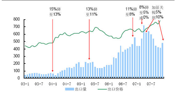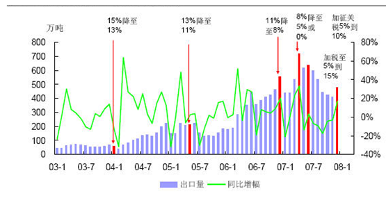 2007年政府政策调控的结果,我们认为抑制和促进出口的作用几乎是“平分秋色”。由于大家提前预知政府即将出台钢材出口退税、进一步降低或加征关税的政策,在某种程度上促进了出口;一旦政策开始执行,政策的调控效果则明显地显现出来,出口量在一定程度上受到抑制。