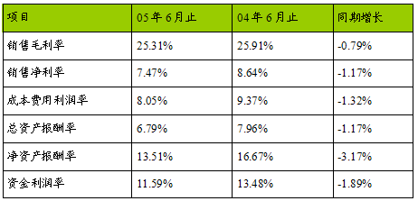 2005年上半年全 行业 的盈利能力总体情况较去年有所下降。其中 行业 的销售毛利率为25.13%,下降了0.79%, 行业 主营业务的获利能力有所下降;销售净利率为7.47%,下降了1.17%, 行业 通过销售获利的能力有所下降;成本费用利润率为8.05%,下降了1.32%, 行业 通过投入所得的利润的能力也有所下降;总资产报酬率为6.79%,下降了1.17%,表明 行业 资产利用效果不如去年,整个企业的活力能力减弱,经营管理水平存在一定问题;净资产报酬率为13.51%,下降了3.17%,表明投资者通过投资获利的能力亦有下降;另外,资金利润率为11.59%,也下降了1.89%。应该注意,盈利水平的下降主要集中在一季度全 行业 的开局不利,而这一情况在二季度变为强劲反弹。