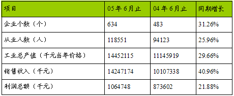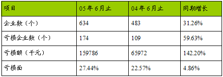 2005年上半年的634个企业中,有亏损企业174个,亏损面达到27.44%,亏损额达到159,786千元。与去年同期相比,亏损企业的数量同比增长了59.63%,而亏损额发生了高达142.20%的增幅。这在一定程度上反映了虽然 行业 整体高速发展,但是 行业 内部的分化的速度也是相当快的。