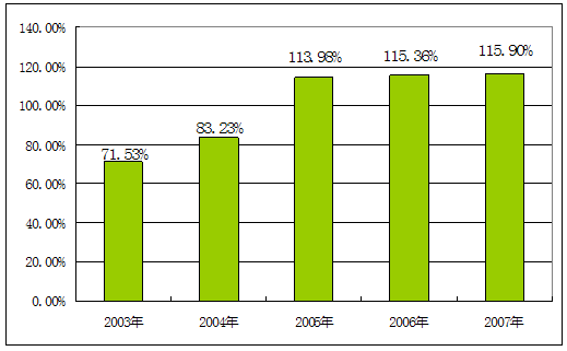 07年房地产市场和股票市场均成为焦点,除了经济自身发展需要外,过多的资金涌入是推动两大市场过度膨胀的关键。07年中国固定资产投资增速保持在26%的水平,其中房地产增速高达30%,股票市场也一跃至6000点,全年最高涨幅超过100%;07年金融数据显示,短存长贷现象明显,存款活期化趋势不改,贷款去向很大一部分是房地产市场,而存款活期化是老百姓对股票市场的青睐所致,虽然央行连续加息,但负利率现象却没有消除,低利率、低劳动力成本所带动的高投资热情不断冲击着银行的放贷防线,另外,海外资金对国内企业的的资产注入部分也是造成07年流动性过剩的原因。从货币供应量数据上来看,2007年11月末,广义货币供应量(M2)余额为39.98万亿元,同比增长18.45%,增幅比上年末高1.51个百分点;狭义货币供应量(M1)余额为14.80万亿元,同比增长21.67%,增幅比上年末高4.19个百分点;市场货币流通量(M0)余额为2.90万亿元,同比增长13.56%,可以看出,07年市场流动性是非常充裕的,而流动性过剩目前也是全球性现象。