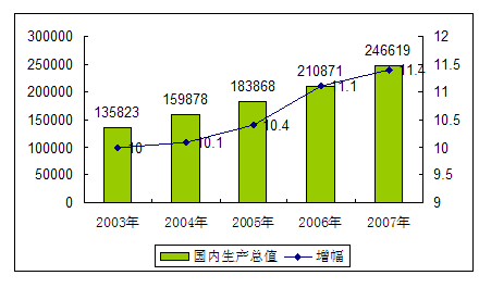 2003年-2007年国内生产总值及其增长速度 单位:亿元;%
