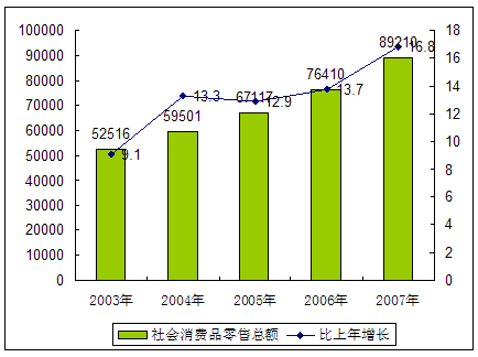 2003-2007年社会消费品零售总额及其增长速度 单位:亿元;%